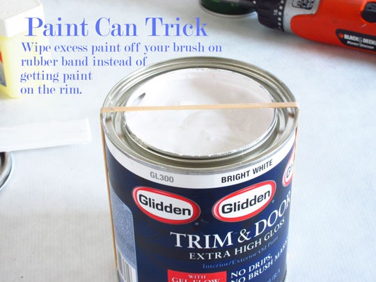 Duct tape over the top of the can works much better than a rubber band, which has to go under the can. Duct tape is stiffer, so it’s easier to wipe a brush across, and there are no paint-covered flying rubber bands when you are ready to put the lid on :)