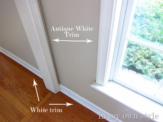 Now the only downside of painting trim is that where the newly painted trim meets the old trim around the doorways – the old color looks dingy.
