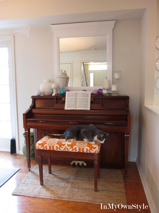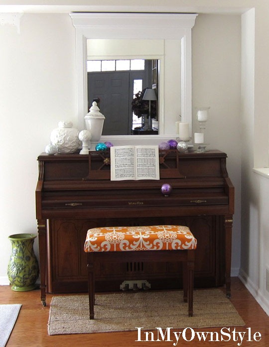 Hi Diane, I am not a professional decorator but I think if you put some greenery or some fall colors on the top of the piano it will give it more life in the room and fall candles, candle rings, vase of berries and leaves etc will pull it all together with your beautiful piano bench cover. Love your blog. And I have a mollifer! I just didn’t know what it was called!