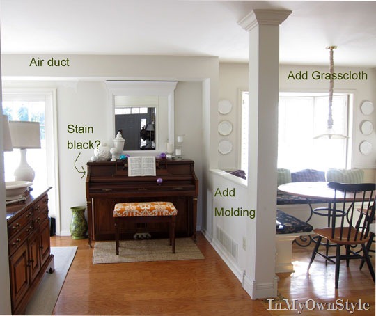 My next plan of action is to add some molding and bead board to the short wall on the right side of the piano. That might add some interest and contrast, also. There is an air duct in the wall above the mirror that runs the length of the room.