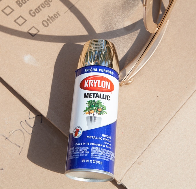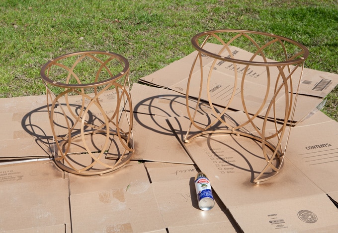 If you have ever used gold spray paint then you know every brand produces a slightly different shade of gold. Some are more bronze, others more orange or rose. I used Krylon Special Purpose Metallic since it has more of a champagne gold tint to it. It is whiter and less brown. It was the shade I wanted for the tables.