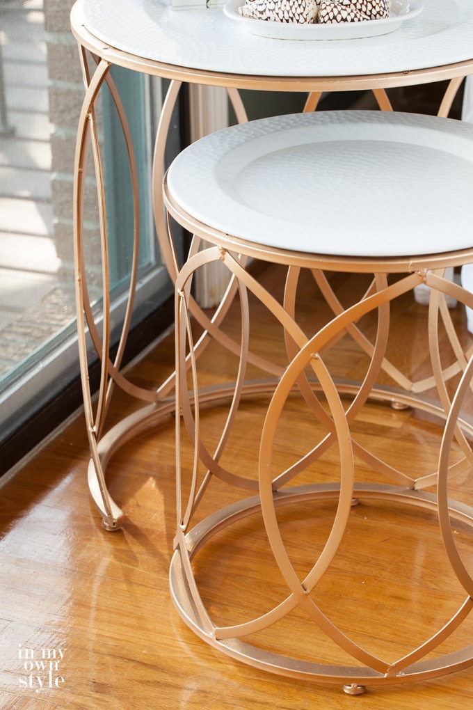 Back in the fall I showed you this set of nesting tables that I wanted to get for the living room in my new house. I like the double duty that they provide, the modern vibe, and the textural mix they will add to my room since they are metal, not wood, but wasn’t sure I wanted to pay $249 for them.