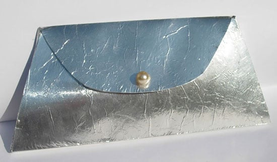 5. Turn clutch back over. Trim foil by cutting tabs into the excess. Run a glue stick on the outer edge of bag and fold the tabs over.