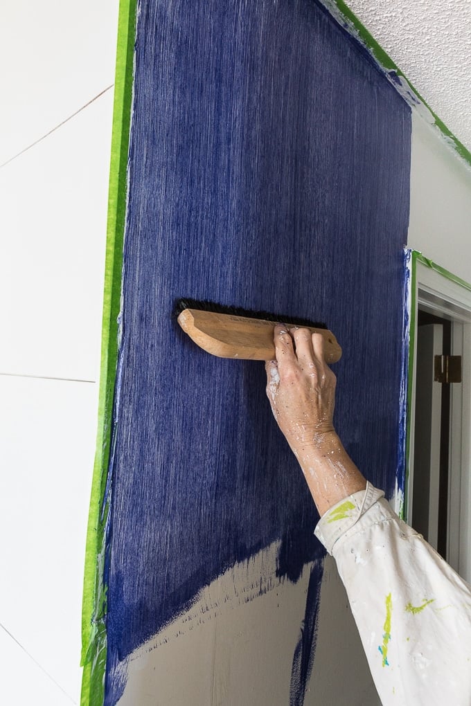 Use a wide strip of painter’s tape along the ceiling where it meets the wall. This will allow you to place the tip of the dragging brush bristles right up to the ceiling edge and then drag it down through the paint.