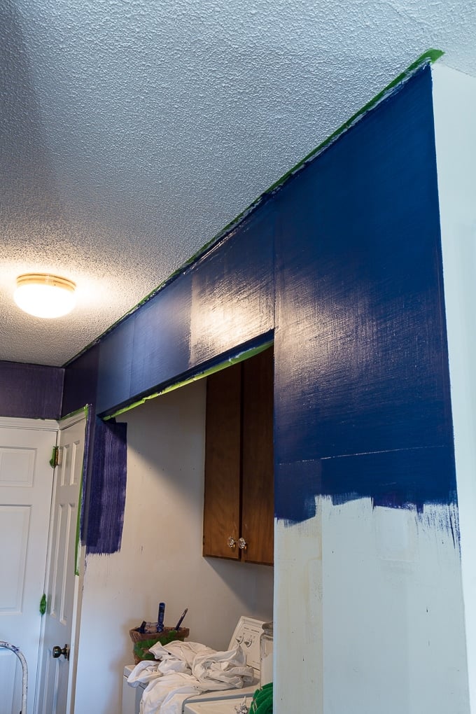 To paint you half bath wall you will need to base paint the wall either a light version of your dark navy. Once this is dry use the darker shade and then brush horizontally to expose the lighter color underneath. You can also do it in reverse, but I think the lighter base color looks more dramatic.