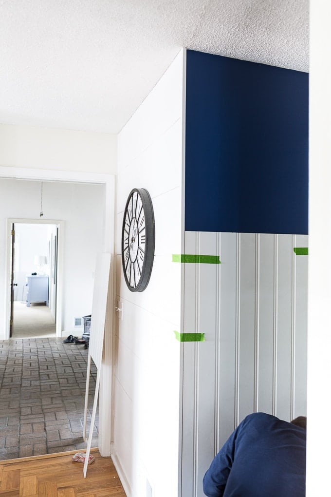 When all the paint was dry, we added the bead board paneling and cap to the lower 3/4’s of the wall.