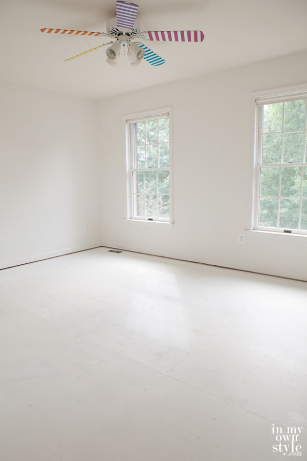 What a difference a coat of white primer makes. Every surface now looks fresh and clean, except the ceiling fan that I plan to eventually paint. I will be posting a full tutorial on the steps I needed to do to paint the subfloor next week.