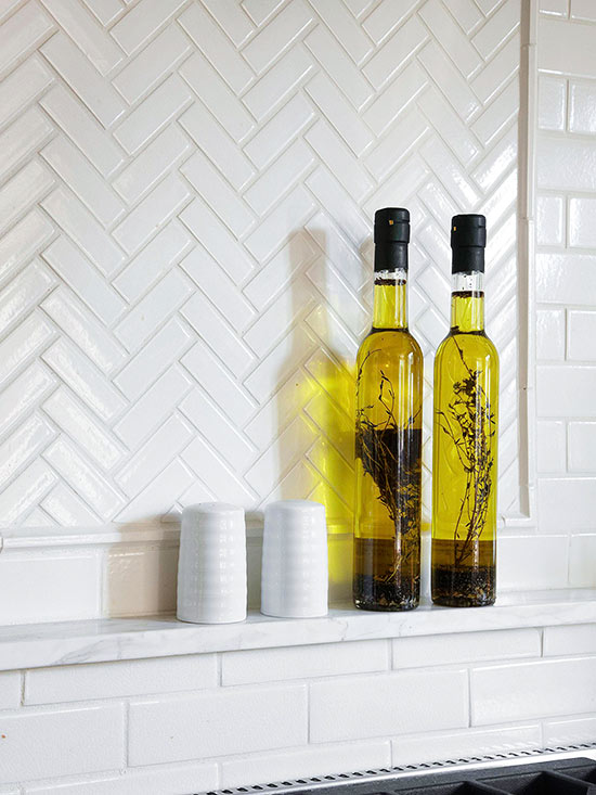 Bright White Subway Tiles set in a herringbone pattern is quite popular now. The grey grout makes the pattern stand out…