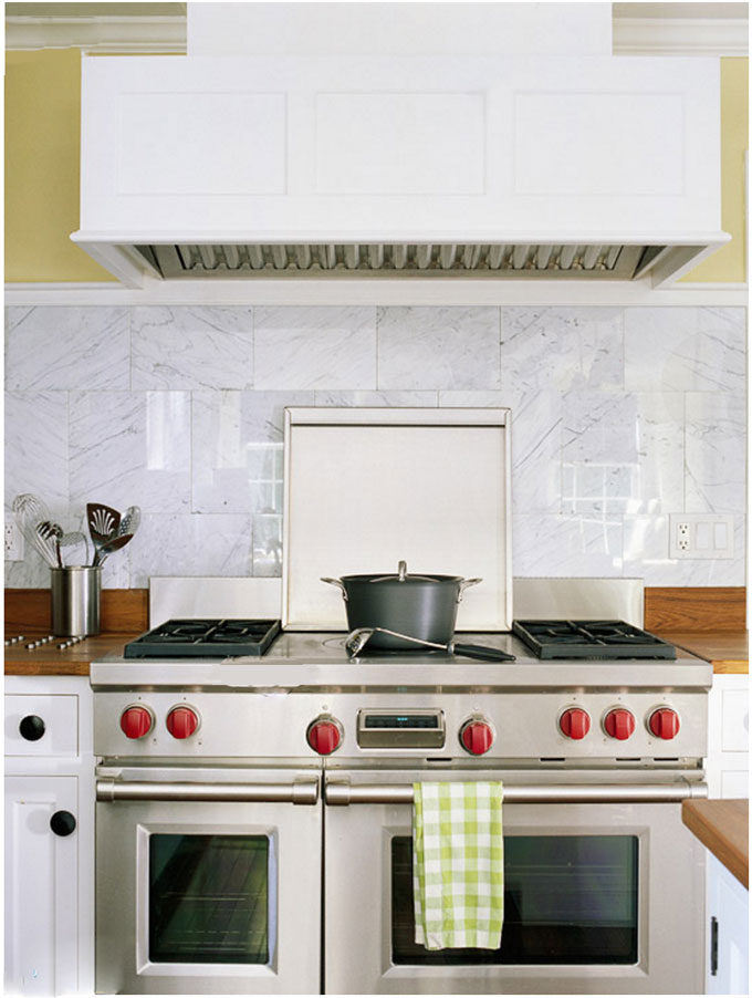 Another white option I am considering is 12″ x 12″ Carrara white polished tiles. The polished shine makes them look clean and fresh and a nice contrast to the stainless range and wood countertop.