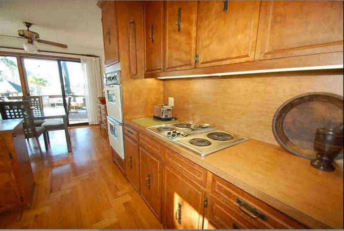 Here is a photo of one side of the kitchen. It is not a big kitchen, but well maintained. It is floor to ceiling brown wood, not my favorite color. :-)