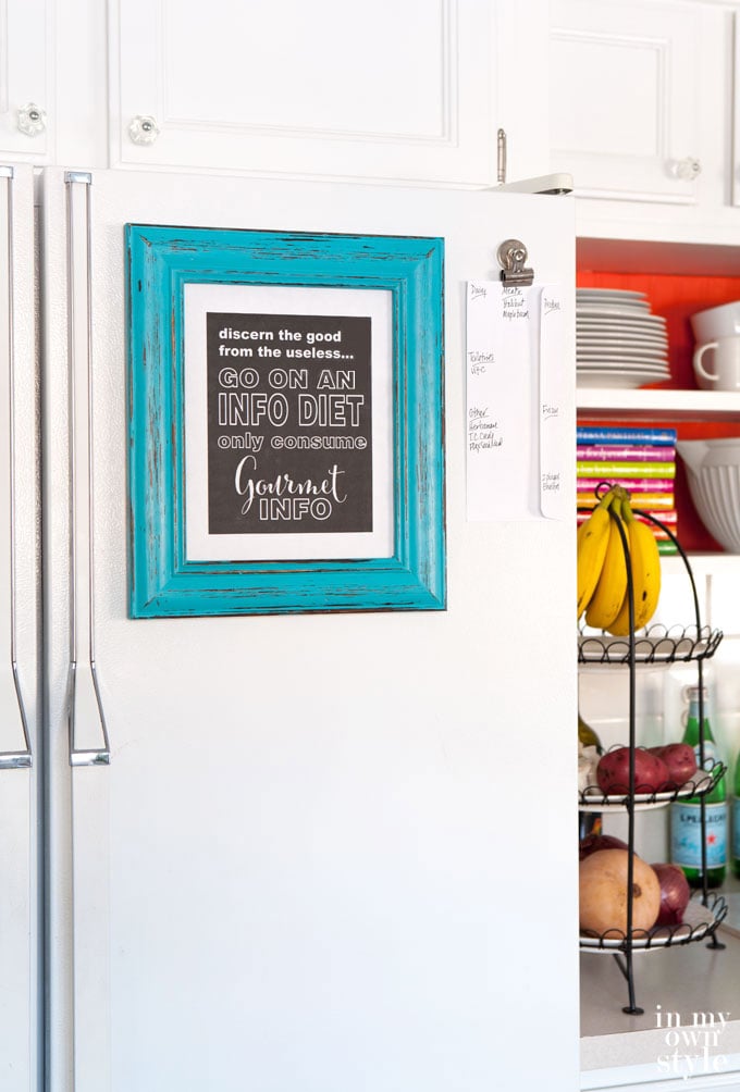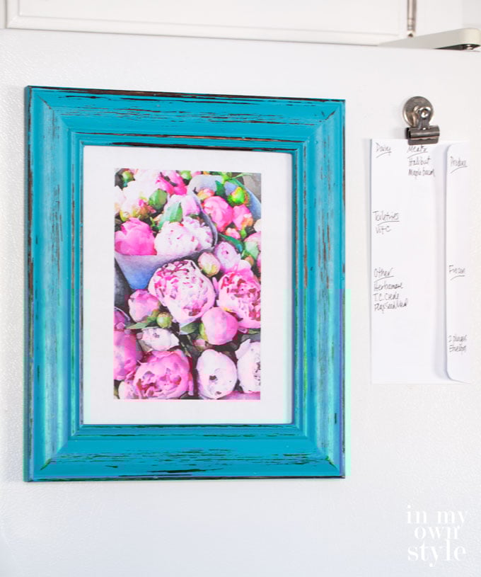 Hi Michelle – thanks. I like the clean look on a fridge, too. When my daughter’s were little I had a collection of flat acrylic frames on the fridge that I put their art masterpieces in. It kept the fridge nice and neat and protected their art, too. I had a few colors in mind to paint the frame, but I chose the turquoise since I have a sideboard in my family room that is the same color.