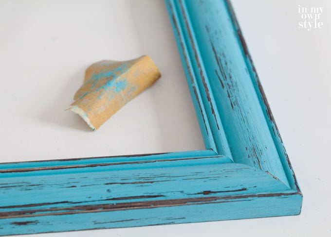 2. Once throughly dry, run sandpaper over the finish and edges to distress. If you distress too much or don’t like how a certain area looks on the frame, simply repaint the area, let dry, and distress again.