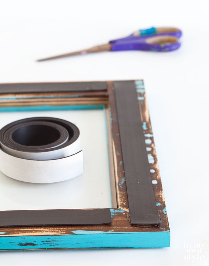 4. Make sure the back of the frame is free of any dirt and oils. Clean if necessary and let dry. The magnetic tape won’t stick to dirty surfaces. Unroll the tape and let it sit unrolled for a while so it lays flat. Once it is not curling, cut long sections to fit each side on the back of the frame. Peel off backing on tape and place on frame.