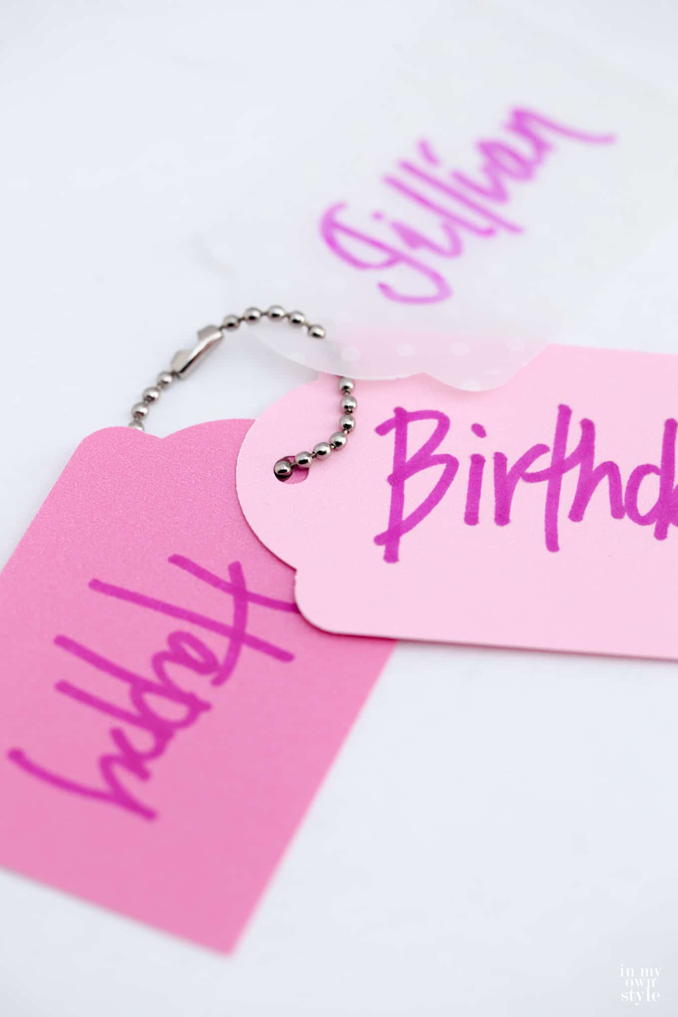 Remember these old style key chains? I have a few in my stash. They work perfectly to hold the tag onto a gift bag.