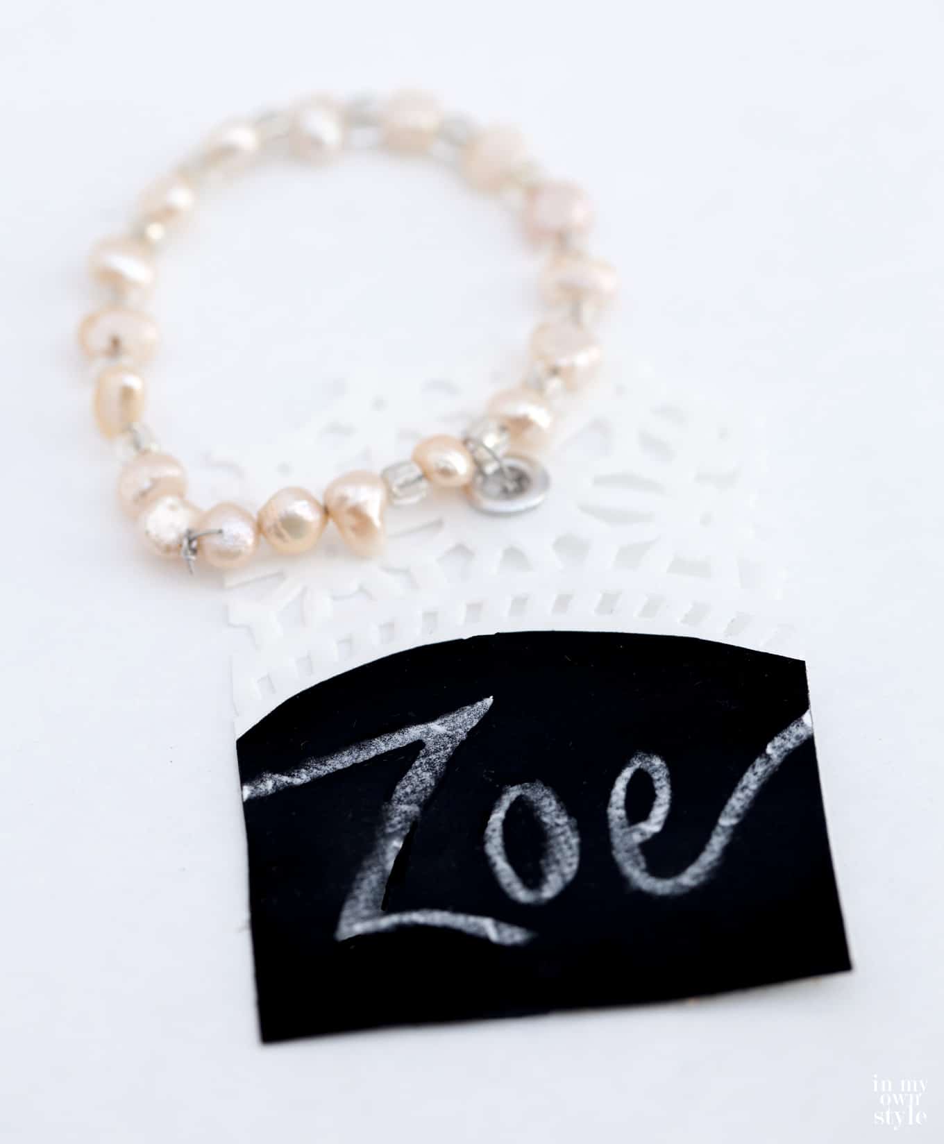 Paper doily with a chalkboard sticker cut to fit on top. Thin paper like doilies will cut in the tag maker, but may need to be trimmed with scissors. I used a beaded bracelet instead of ribbon. It makes the tag easy to hang from the neck of a bottle of wine.