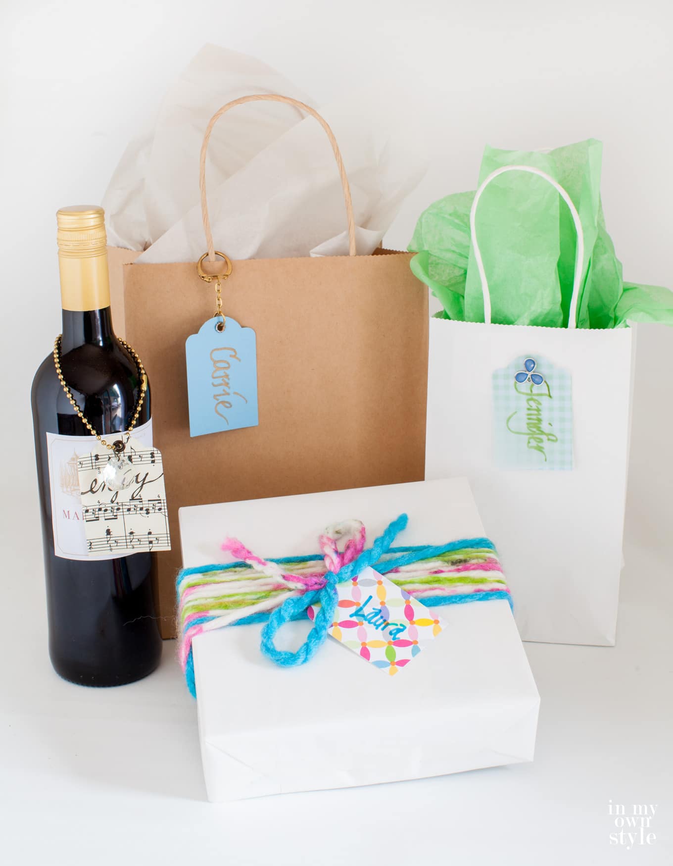 Use the front of a notecard or piece of stationery. Large rings to attach the tag to the handle of a gift bag or a ribbon can be found in the jewelry making aisle at the craft store.