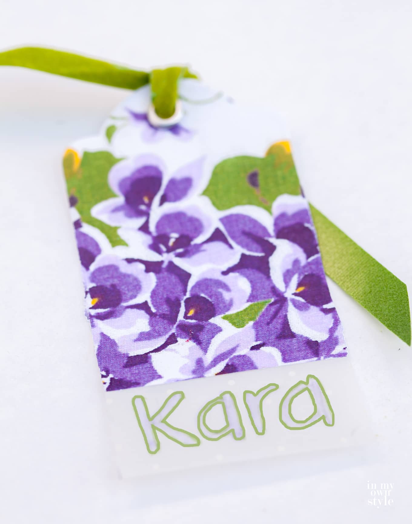 Scan a vintage hankie on your printer to make a Mother’s Day gift tag. To create a longer tag, glue a second coordinating tag under the first one so that 1/2″ shows. This will be enough to write a name on.