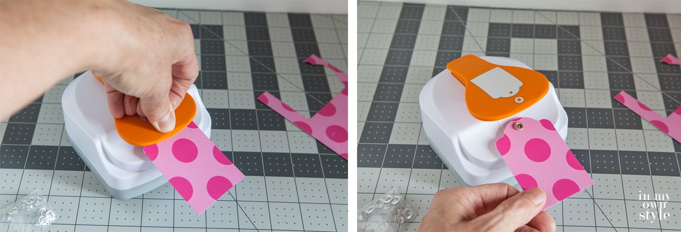 5. Place an eyelet into the hole in the card card stock and press the lever to attach the eyelet.