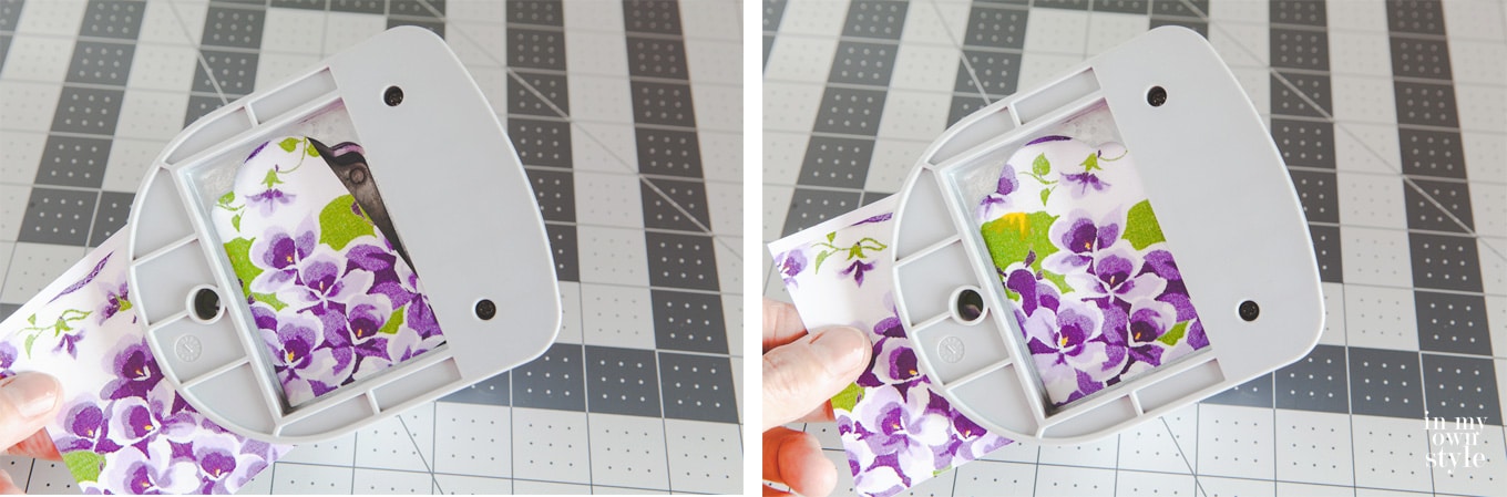 If you are using patterned paper, turn the tag maker upside down so you can line up the paper to center the pattern or image. You may need to trim the paper before placing it in so you get the exact pattern area you want.