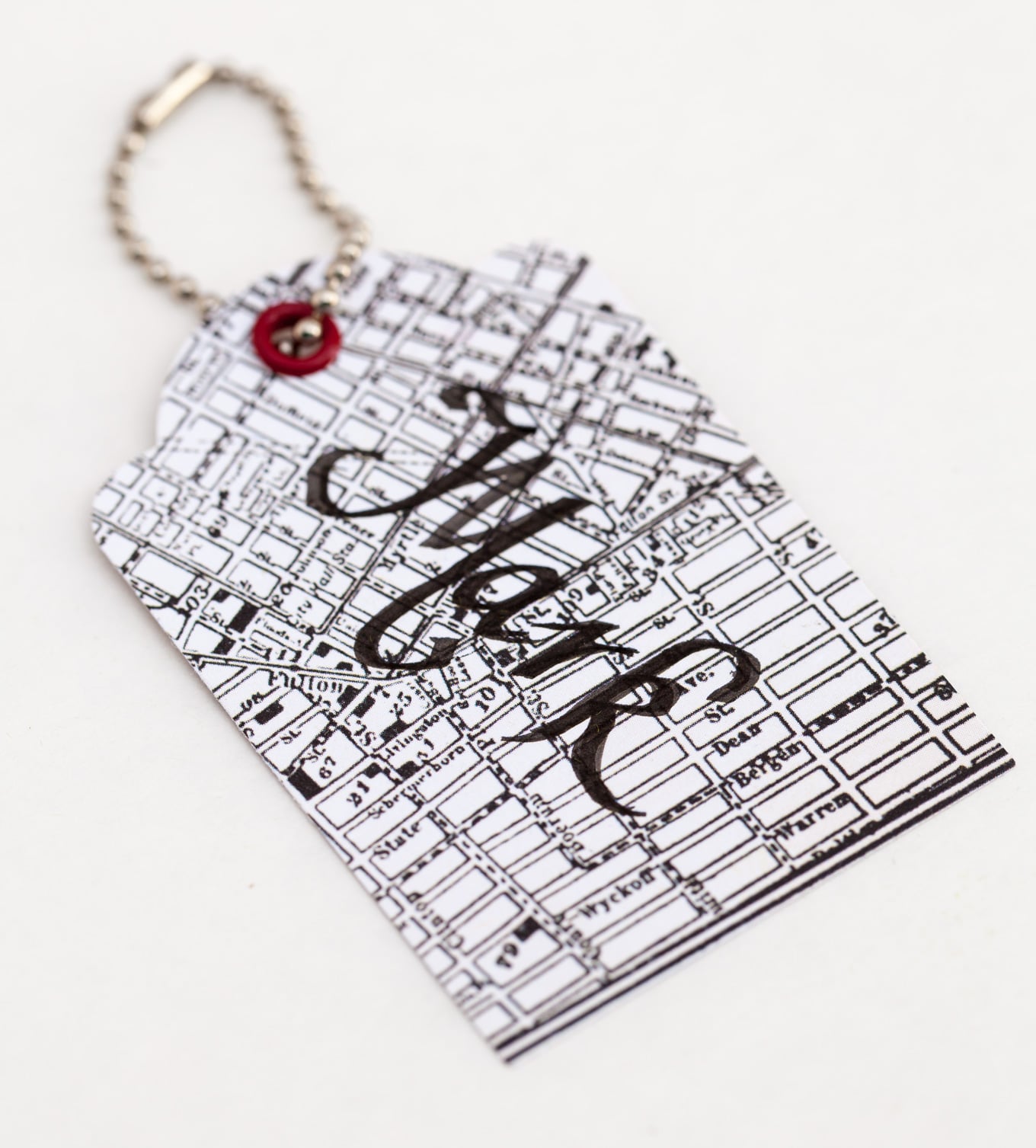 A map of your favorite city makes a very hip tag. A red eyelet pops against the graphic black and white map.