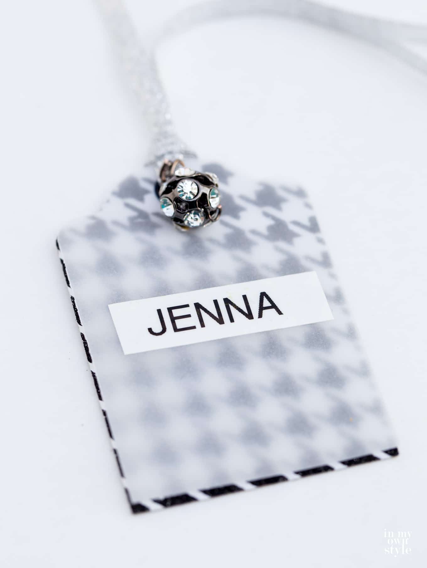 I used 2 layers for this tag. I used vellum over houndstooth paper, added a black eyelet and hung a bead from the eyelet. I created the recipients name with a label maker.