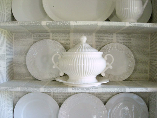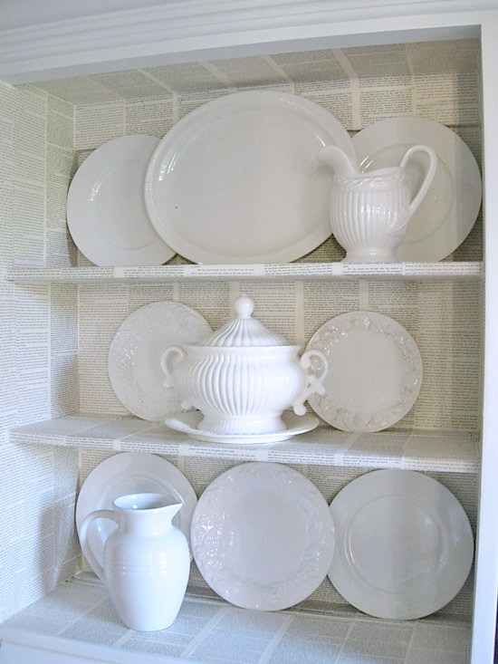 How pretty. That is a nice hutch. That’s a great use of those book pages. -Love the white pottery in it.