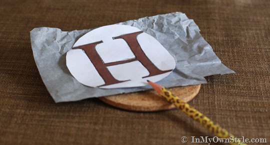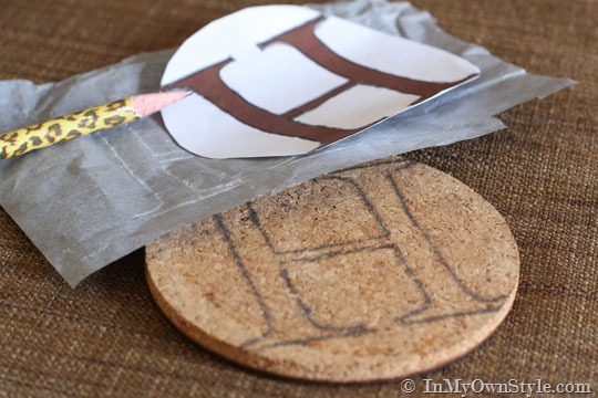 1. Lay transfer paper face down on coaster. Center cut out letter on top. Make sure it is straight. Using a pencil make an outline of the letter. The pressure of the pencil point will transfer graphite on the transfer paper to the cork.