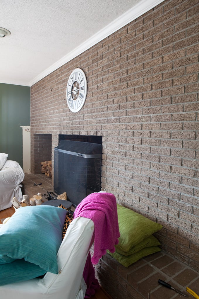 I love Roman numeral clocks, I collect them. I have this white one above the fireplace. It may not be staying here once we see how much space the mantel we are planning to add to the wall will take up.