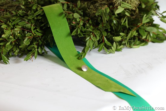 2. Fold the length of ribbon in half and loop around the top section of the wreath. Bring the ends together on top of the wreath.