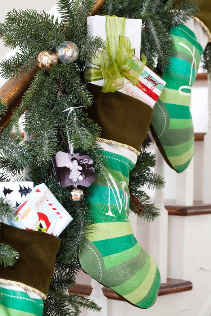 You can hang them by themselves or on garland and even include a few holiday ornaments along the railing with the stockings to create a festive holiday display.