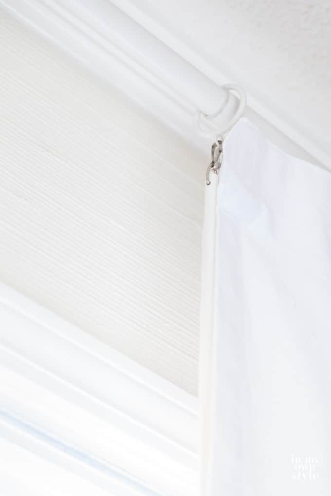On the white drapes I bought at Target,(no longer available). Here are similar. I used the back tabs that are used to slide a rod through to attach each hook instead.