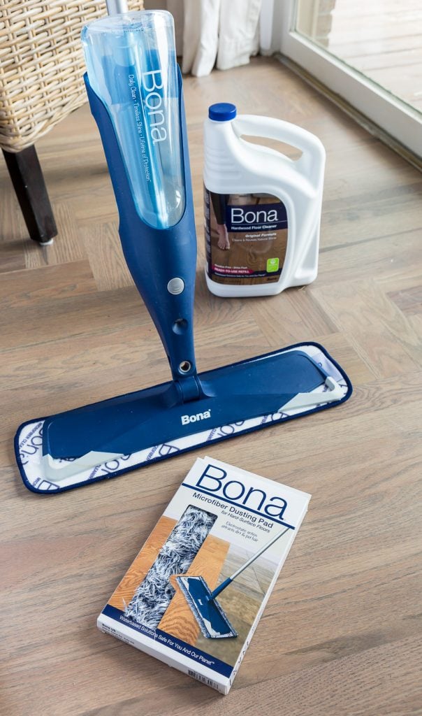 I have been using the Bona Premium Spray Mop and cleaner. What I like most about the mop is that both the wet cleaning pad that comes with the mop and the additional dry microfiber dusting floor cleaning pad are washable – you simply throw them in the washer and dryer and then re-use. No need to have to keep buying cleaning pads.