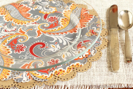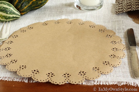 I like my Thanksgiving table to have brown accents – I think it makes the table warm and cozy with rustic simple touches from nature. I used Kraft paper while making doily placemats, but you could also use brown paper grocery bags.