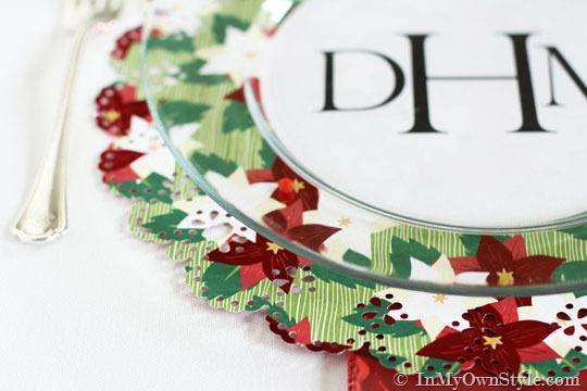 For this Christmas place setting, I typed in my guests’ initials in monogram form on my computer and printed and cut them out. When placed on top of the circle punched scrapbook paper placemat- it acts as an elegant plate place card when the glass plate is set on top.