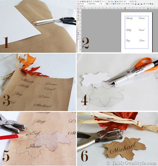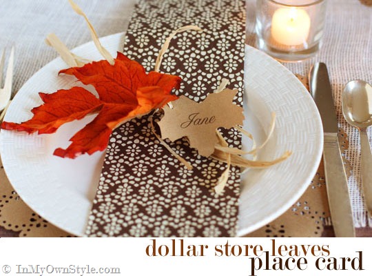 How to make fall leaf table place cards for Thanksgiving or fall table settings using brown paper bags and dollar store faux leaves.