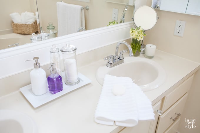Some fresh flowers, a bar of soap and a candle help make the counter feel more spa-like without making it look cluttered. Fluffy white towels and a white tray are a good option to hold a few bottles of lotions and other products.