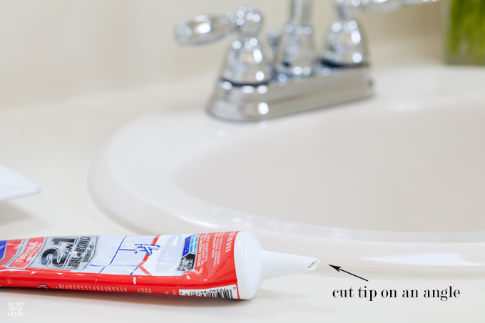 - The most important step is to cut the tip on the tube of caulk on an angle and the opening no bigger than 1/4″. The angle and size cut make for the perfect bead of caulk to be dispensed as you press the tube and move around the sink.