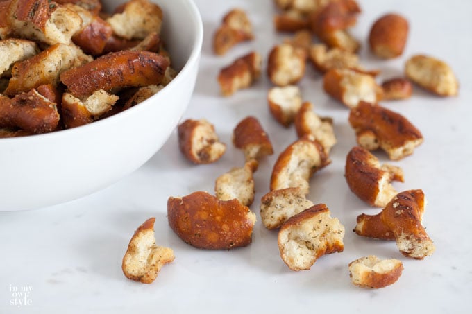 Hi Lynn – There are two reasons to break the pretzels. 1. Smaller into bite-sized pieces makes it easier to eat. 2 Smaller pieces allow more of the seasoning to get all over the pieces and will taste better. If you leave the pretzels whole – only the outer side gets seasoned.