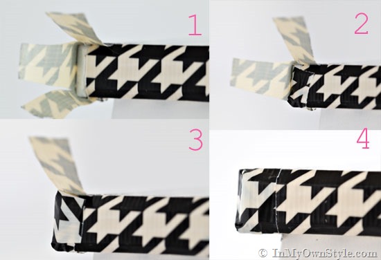 The Houndstooth pattern is easy to match up. Cut each strip/piece of duct tape long enough to wrap underneath the top edge of the stool and step.