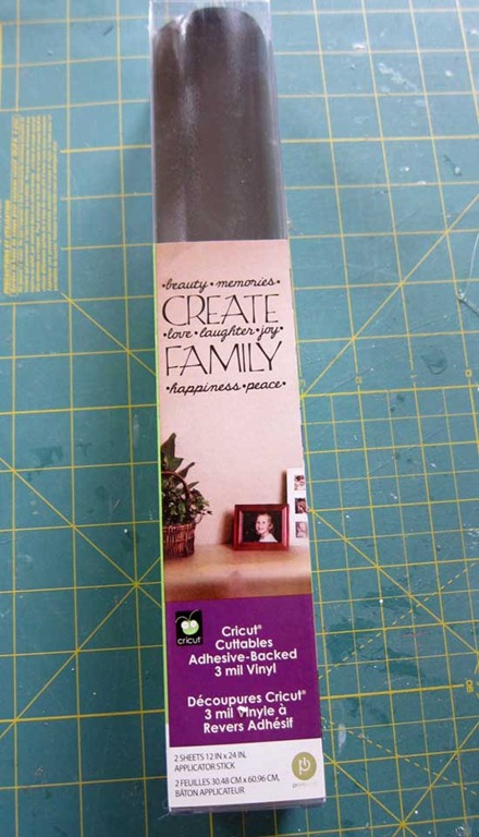 If you have been reading my blog for a while you know that I used to work in Retail Display. One of the daily projects I did in the store was apply vinyl VATS – manufacturer’s logos, promotions, etc. all over the store. In the display windows, on cosmetic counters, walls, and floors. They were always so hard to remove even with water and a razor blade after the promotion was over. The ones on the floor after high traffic trampled all over them were nearly impossible to remove. I knew if I could get my hand on some black vinyl I could make my own VATS – plain black square ones. I was going to go to one of my display buddies and ask them to give me some of their excess black VATS, but I wanted to create something with a product that anyone could buy easily. At Michaels I found rolls of black vinyl made by Cricut. 2 adhesive backed 3ml sheets for $10.