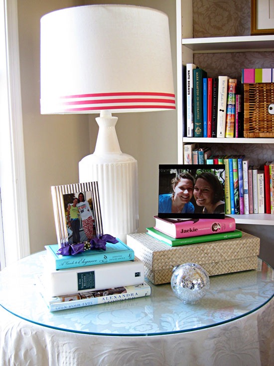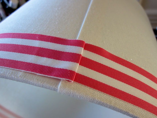 I simply turned one end of the ribbon under to create a clean edge and hot glued it to the other end of the ribbon on the back of the shade with a dab of hot glue. This way when I want to change it, it is easily removed and no damage to the shade