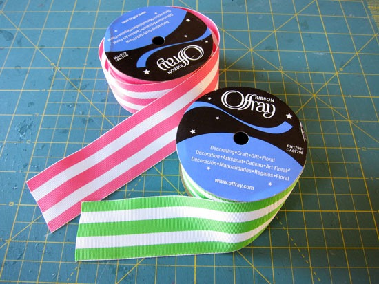 I also had some lamp shades in my stash and chose a white barrel shaped one. I wanted to add a bit of color to it in the way of ribbon. I found some inexpensive bright and cheery ribbon at Walmart. I bought two because I could not decide which color I liked better.