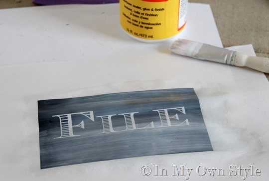 Brush on a thick even coat of Mod Podge on top of your .pdf printout or paper.  Don’t move the brush around too much as you don’t want to smear the ink.