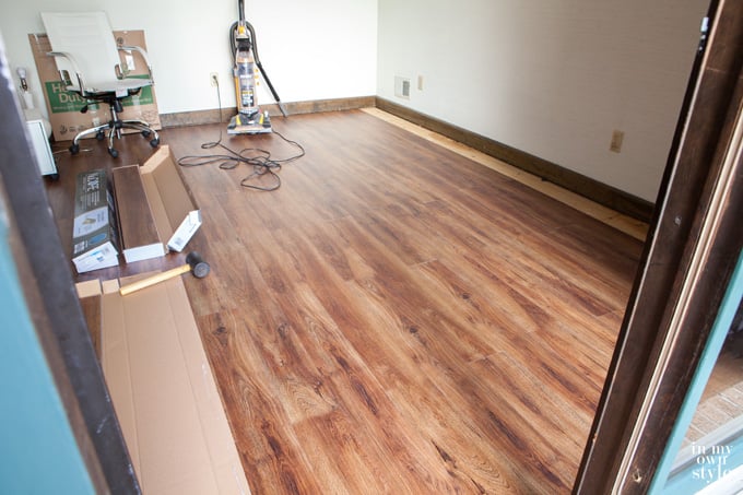 If you are not familiar with this type of flooring, luxury vinyl plank flooring is made to look like wood and that goes together in a snap… literally… each plank snaps into the next. This type flooring is also known as a floating floor that can go right over the subfloor or existing flooring like tile and linoleum.