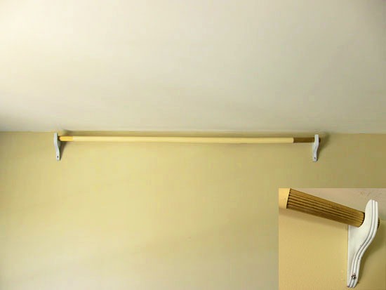 Another curtain hanging idea: Dowels. I happen to keep them around for projects and was really hard up for a curtain rod one day. I have found they work just fine. Sometimes, if I don’t get a nice cut on the end (after cutting them the right size for the window) I have to sand them a bit so they don’t snag the fabric. They can be stained or painted (though I never have). And you can buy different sizes very economically at almost any hardware store.