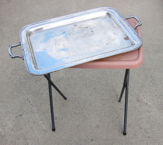 I found these plastic TV tray tables and silver tray at my local thrift store to make my own chic butler’s tray table. They look pretty mundane, but with the magic of some spray paint.