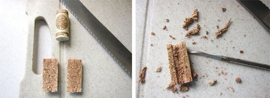 2. The opening on my PVC pipe is 1-1/4” so I needed to cut another cork in half. Depending on the size of the pipe you use – you may not have to add more corks. I used a very sharp bread knife and laid the cork in a channel on my kitchen cutting board to cut the cork in half.