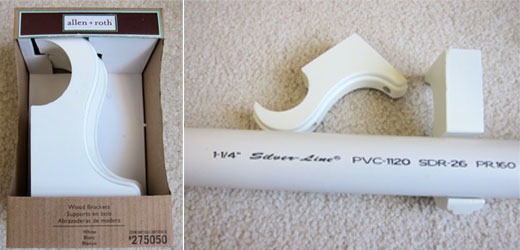 Any clever suggestion on what I can use for brackets? I spray painted a 10′ long heavyweight pvc pipe, possibly 2″ wide, and it doesn’t fit into any of the brackets at Lowe’s.