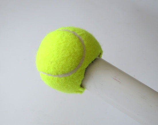 Then push the fabric covered tennis ball onto the end of the PVC pipe curtain rod.