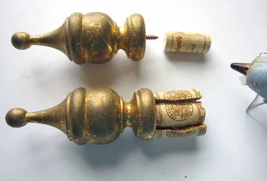 My finials had screws that are meant to screw into the end of wood rods. Since a PVC pipe is basically a hollow tube there was nothing to screw the finials into – time to come up with a way to make the finials work – corks and hot glue to the rescue.